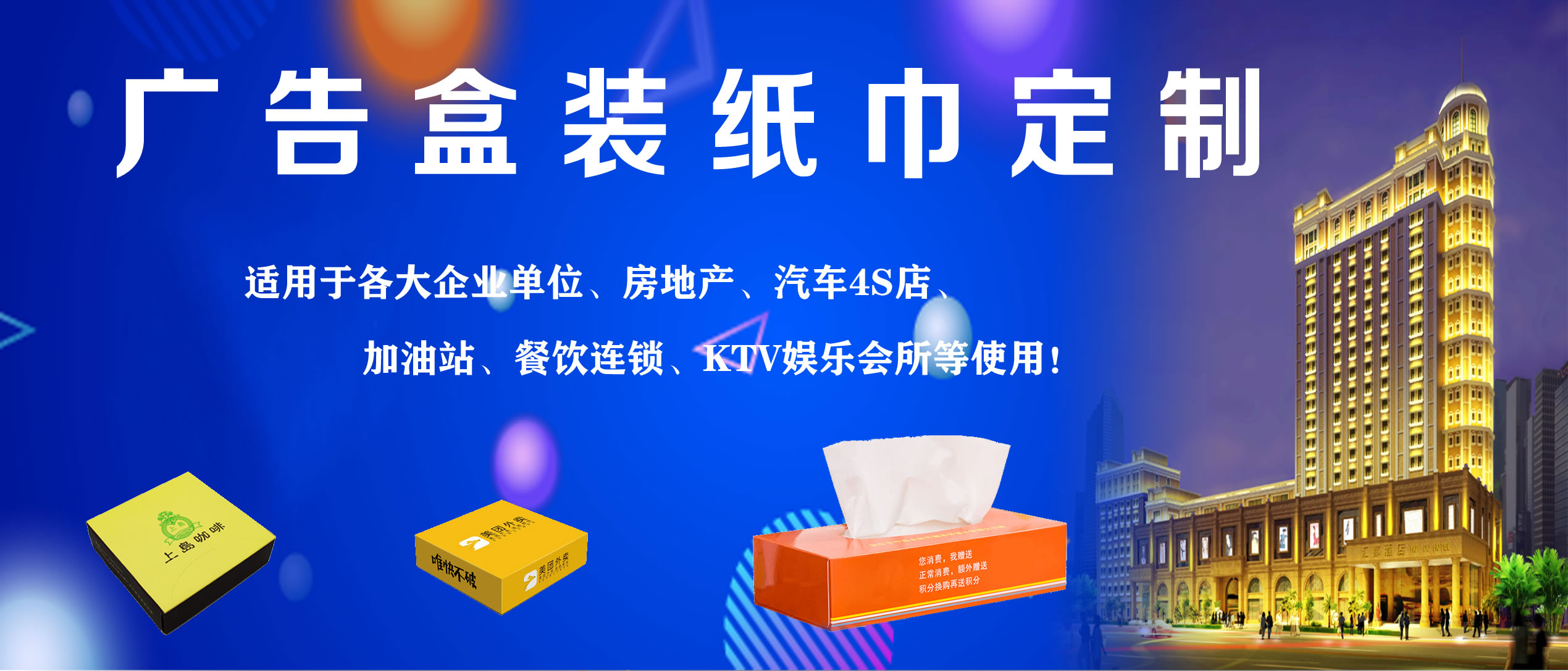合肥億竹紙品包裝有限公司是一家專業(yè)從事各種生活用品定制的企業(yè),定制熱線:18919603840(周經(jīng)理)。公司與各大餐飲行業(yè)、酒店、加油站、學(xué)校、KTV娛樂會(huì)所、銀行、汽車4S店、房地產(chǎn)、廣告公司等客戶長(zhǎng)期合作,業(yè)務(wù)覆蓋安徽全省。公司主營產(chǎn)品:廣告盒抽定制、餐巾紙定制、大盤紙、擦手紙、散抽紙等。有著完善的生產(chǎn)硬件設(shè)備和專業(yè)技術(shù),及長(zhǎng)期從事的豐富經(jīng)驗(yàn)。 我廠專注生活用品多年,致力于生產(chǎn)“精致,高端,綠色,健康”于一體的優(yōu)質(zhì)產(chǎn)品,以誠信、實(shí)力和產(chǎn)品質(zhì)量獲得業(yè)界的認(rèn)可。目前我廠產(chǎn)品已深得寶馬汽車、重慶劉一手火鍋餐飲連鎖、萬達(dá)集團(tuán)、綠地集團(tuán)等眾多客戶的青睞,業(yè)務(wù)量不斷攀升。